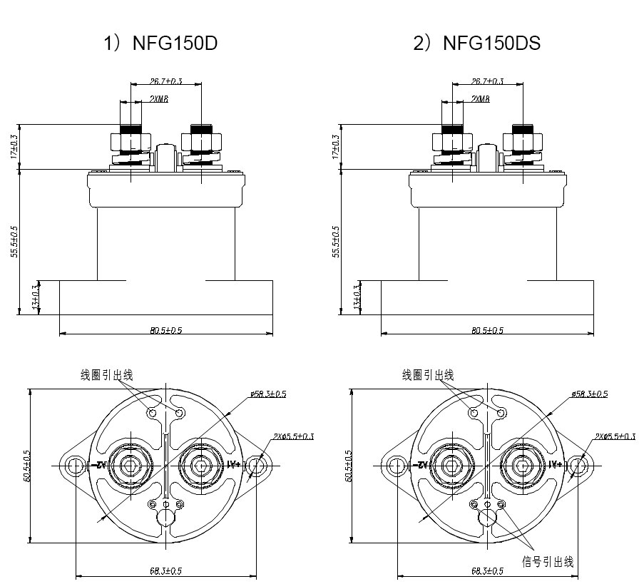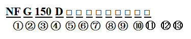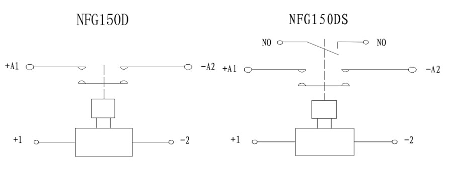 Exemplo: NFG150DS indica que a corrente nominal da carga do produto é de 150A (resistiva), o contato principal é um normalmente aberto (rosca externa) com um contato auxiliar normalmente aberto, a tensão da bobina é de 12V CC e o método de instalação é pela parte inferior.