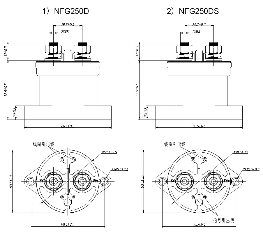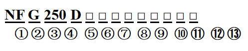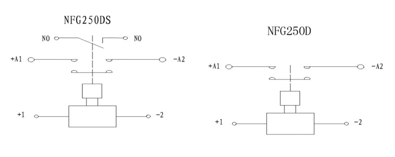 Exemplo: NFG250DS indica que a corrente nominal da carga do produto é de 250A (resistiva), o contato principal é um normalmente aberto (rosca externa) com um contato auxiliar normalmente aberto, a tensão da bobina é de 12V CC e o método de instalação é pela parte inferior.