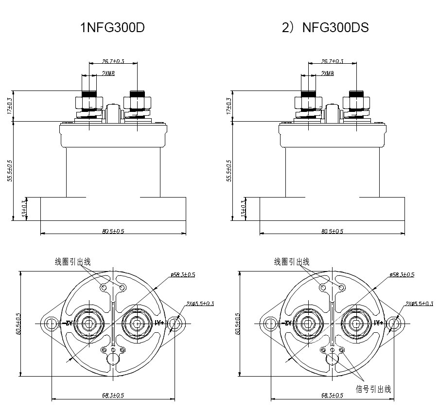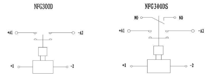 Exemplo: NFG300DS indica que a corrente nominal da carga do produto é de 300A (resistiva), o contato principal é um normalmente aberto (rosca externa) com um contato auxiliar normalmente aberto, a tensão da bobina é de 12V CC e o método de instalação é pela parte inferior.